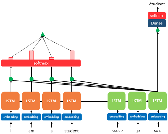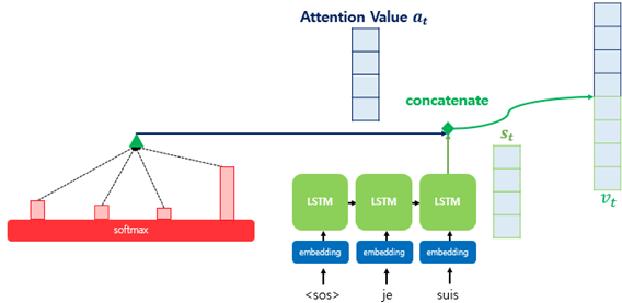 기존 Seq2Seq는 시점 t에서 출력 단어를 예측하기 위해서 디코더의 셀은 두 개의 입력값이 필요
