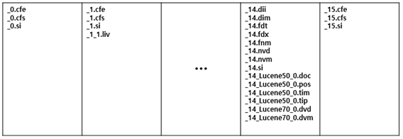 | Index Files | .fnm, .fdx, .fdt, .tim, .tip, .doc, .pos, ... | if (Segment Size >= 0.5Gb) | Index Field, Term Dictionary, Term Vector, Position 등의 인덱스 데이터 파일 |