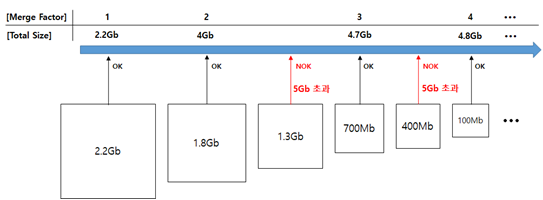 - 한번에 Merge 가능한 세그먼트의 수(Merge Factor)는 최대 10 (Default)